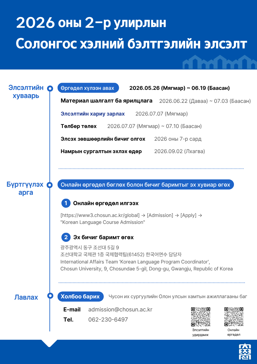 <2026 оны 2-р улирлын Солонгос хэлний бэлтгэлийн элсэлт>