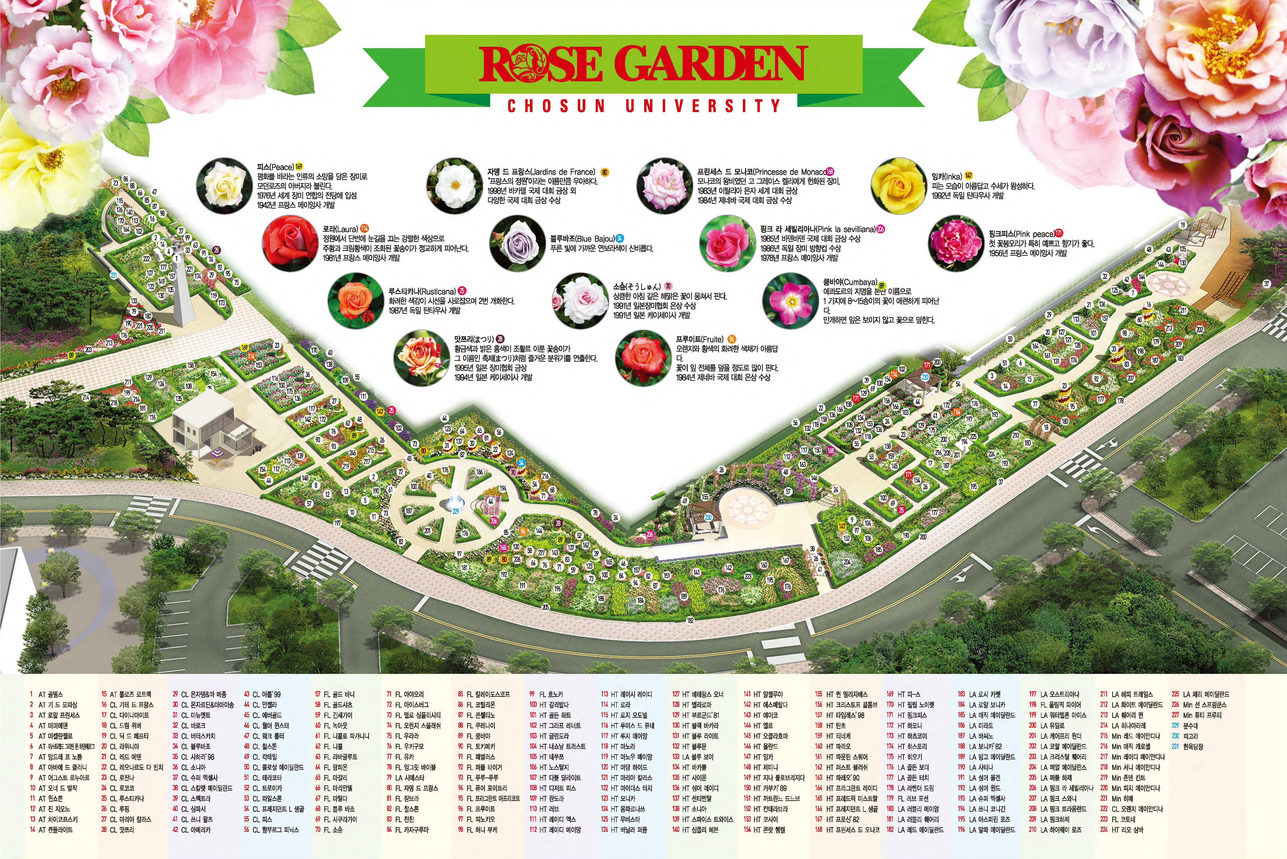 장미보다 아름다운 사랑을 전합니다. 조선대학교 장미원은 2001년 5월, 동문들의 모교사랑에서 출발하였습니다. 장미원의 꽃송이에는 전공 공부에 지친 학생들이 감성과 인격을 수양하여 실력은 물론 사회의 아픔을 돌아보는 따뜻한 마음을 가진 전문인이 되기를 바라는 후배사랑의 마음이 담겨있습니다. 사랑의 향기가 멀리 퍼집니다. 1946년, 광주/전남을 중심으로 7만 2천여 설립동지회 회원들의 자발적인 출연과 참여로 설립된 조선대학교는 이제 지역을 대표하는 대학으로 성장하였습니다. 장미원의 꽃송이에는 대학설립의 기틀을 마련해주신 지역민의 사랑에 대한 보은의 마음이 담겨있습니다. 봄부터 가을까지 세계 각국의 장미가 연달아 피어나는 조선대학교 장미원은 장미를 통해 선배와 후배, 대학과 지역이 함께 만나는 사랑의 공간입니다.