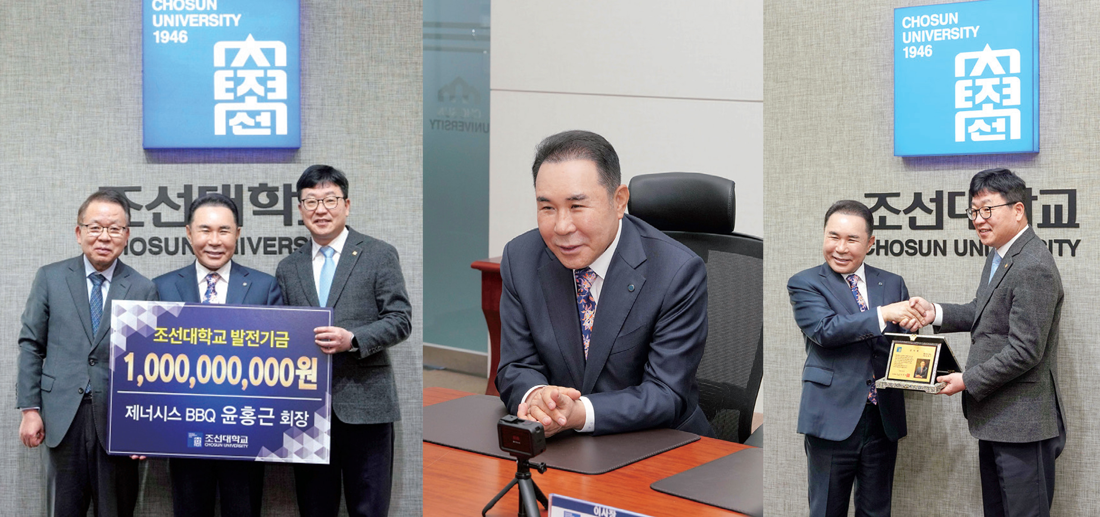 국내 대표 외식 프랜차이즈 기업 제너시스BBQ 그룹 윤홍근 회장이 조선대학교에 발전기금 10억 원을 기부하며 남다른 모교사랑을 실천했다.